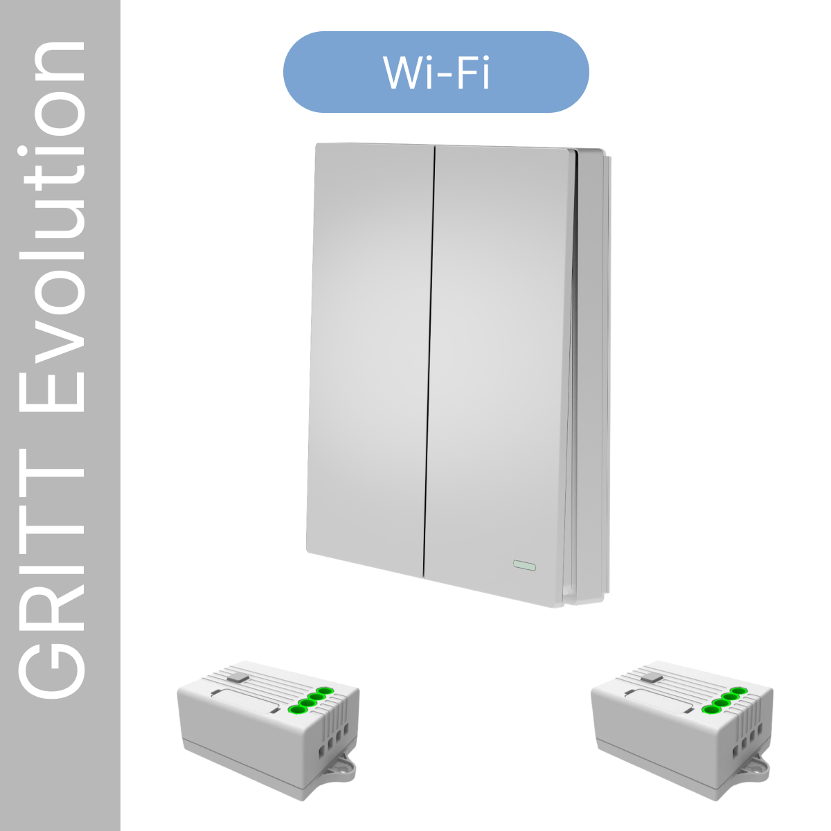 Умный беспроводной выключатель GRITT Evolution 2кл. белый комплект: 1 выкл. IP67, 2 реле 1000Вт 433 + WiFi с управлением со смартфона