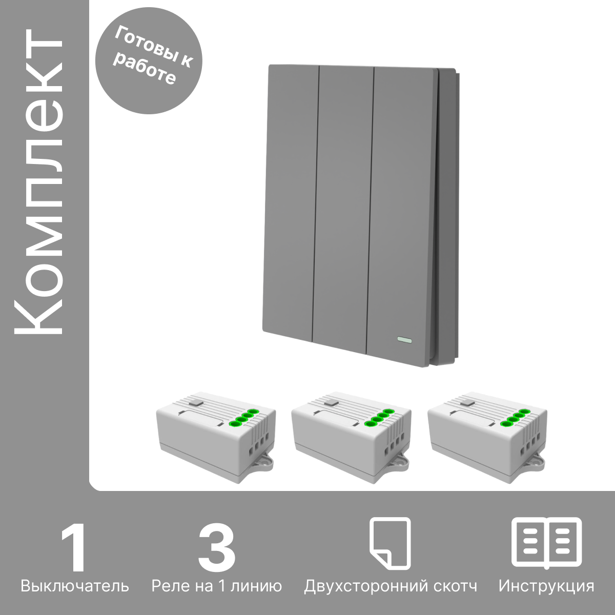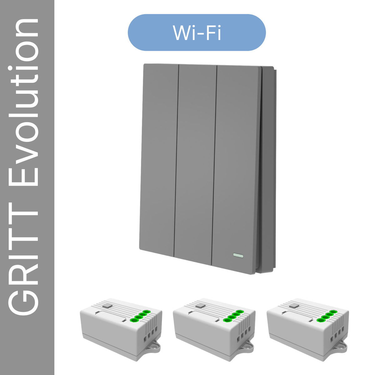 Умный беспроводной выключатель GRITT Evolution 3кл. антрацит комплект: 1 выкл. IP67, 3 реле 1000Вт 433 + WiFi с управлением со смартфона, EV221330BLWF