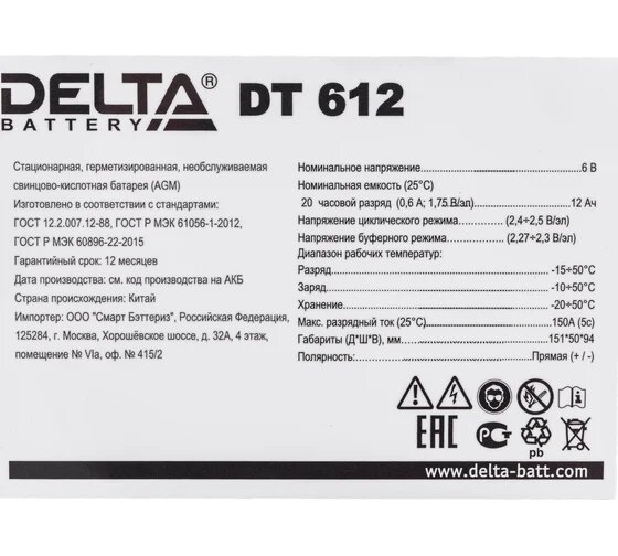 DELTA BATTERY DT612 Аккумулятор ИБП 6В 12А.ч. DELTA (DT 612) (151х50х100) AGM