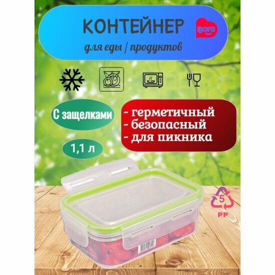 Контейнер прямоугольный Bora крышка на защелках, салатовая полоса, пластик 150х215х55 мм 1,1 л интересное: