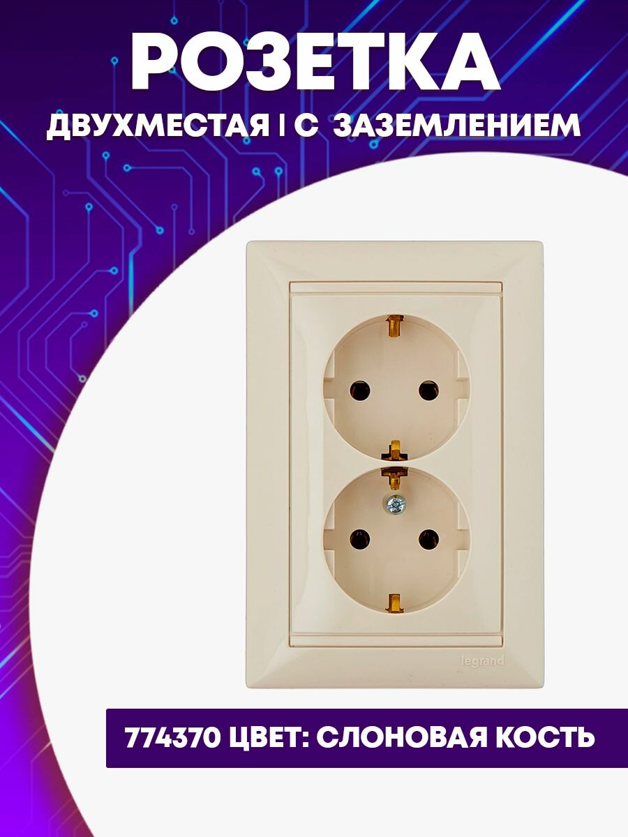 Розетка 2-м СП Valena 16А IP20 2х2P+E с заземл. немецк. стандарт в сборе сл. кость Leg, LEGRAND 774370 (1 шт.)