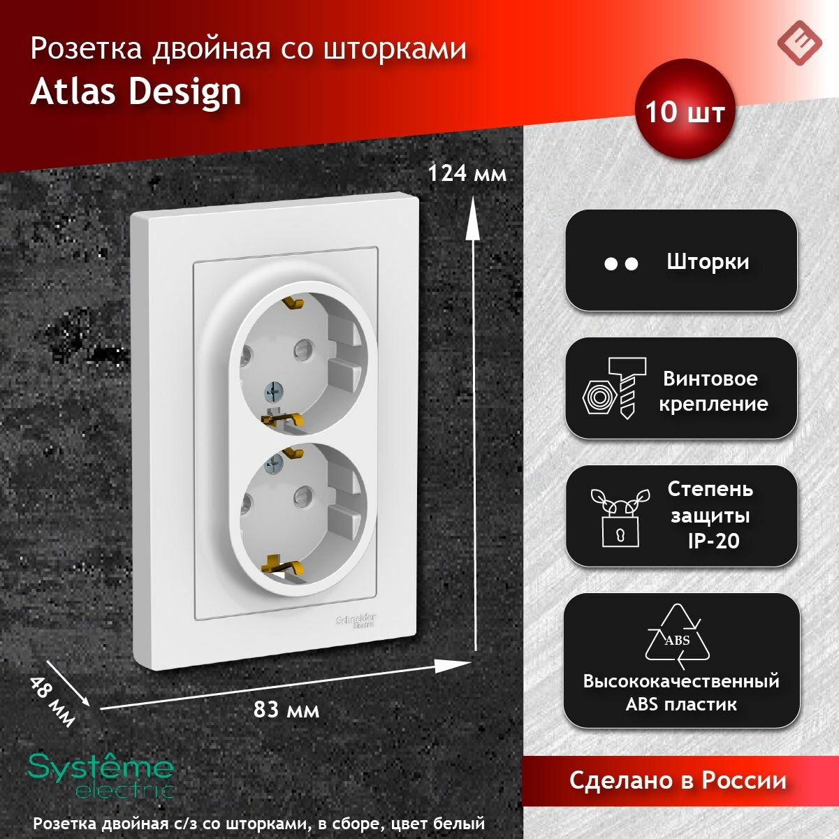 Розетка двойная белая, с заземлением, со шторками,16А, в сборе, Schneider Electric AtlasDesign (комплект 10шт)