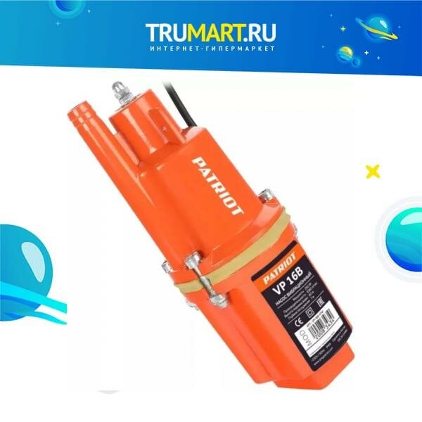 Насос погружной вибрационный PATRIOT VP 16В, верхний забор, кабель 16 м, 250 вт, 18 л/мин, H-60 м, D-96 мм. термозащита.