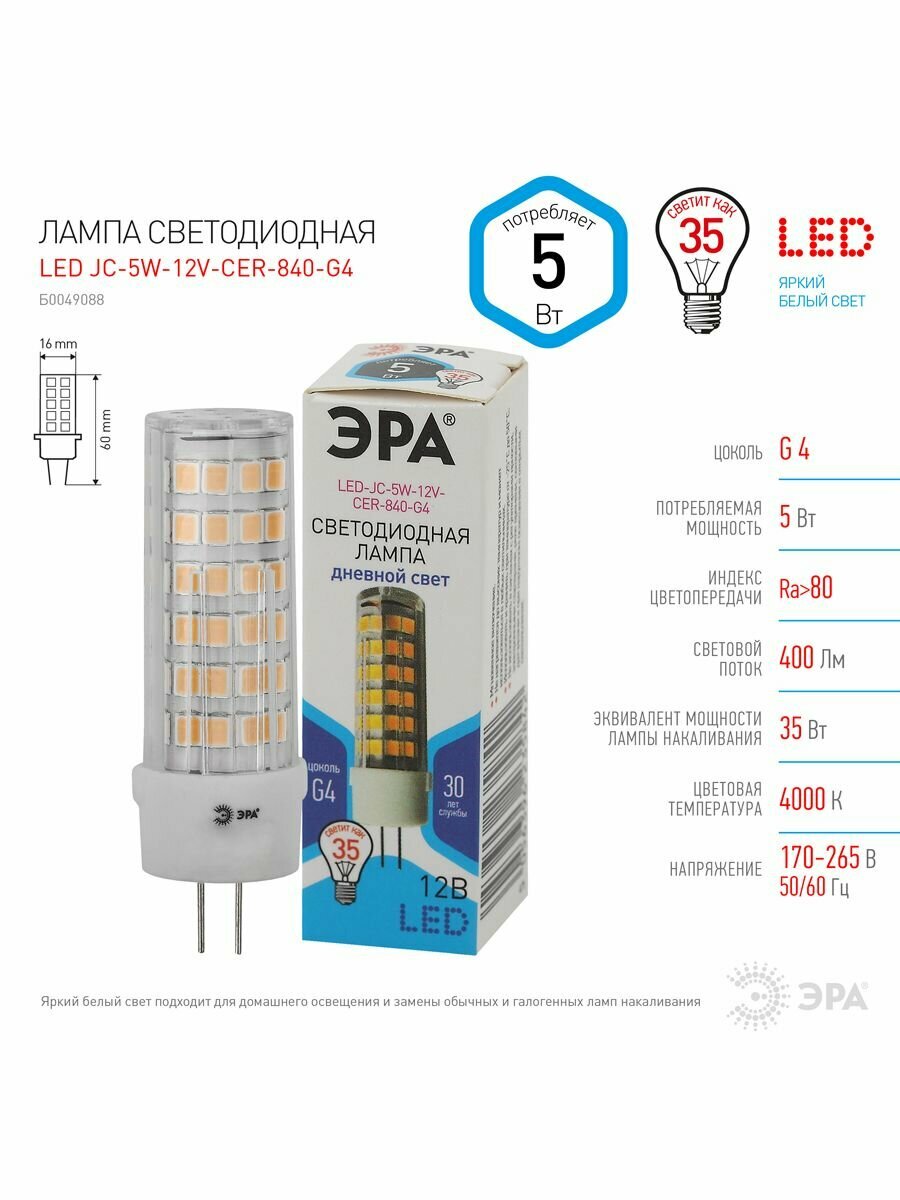 Купить Лампочка светодиодная ЭРА STD LED JC-5W-12V-CER-840-G4 G4 5 ВТ керамика капсула нейтральный белый свет