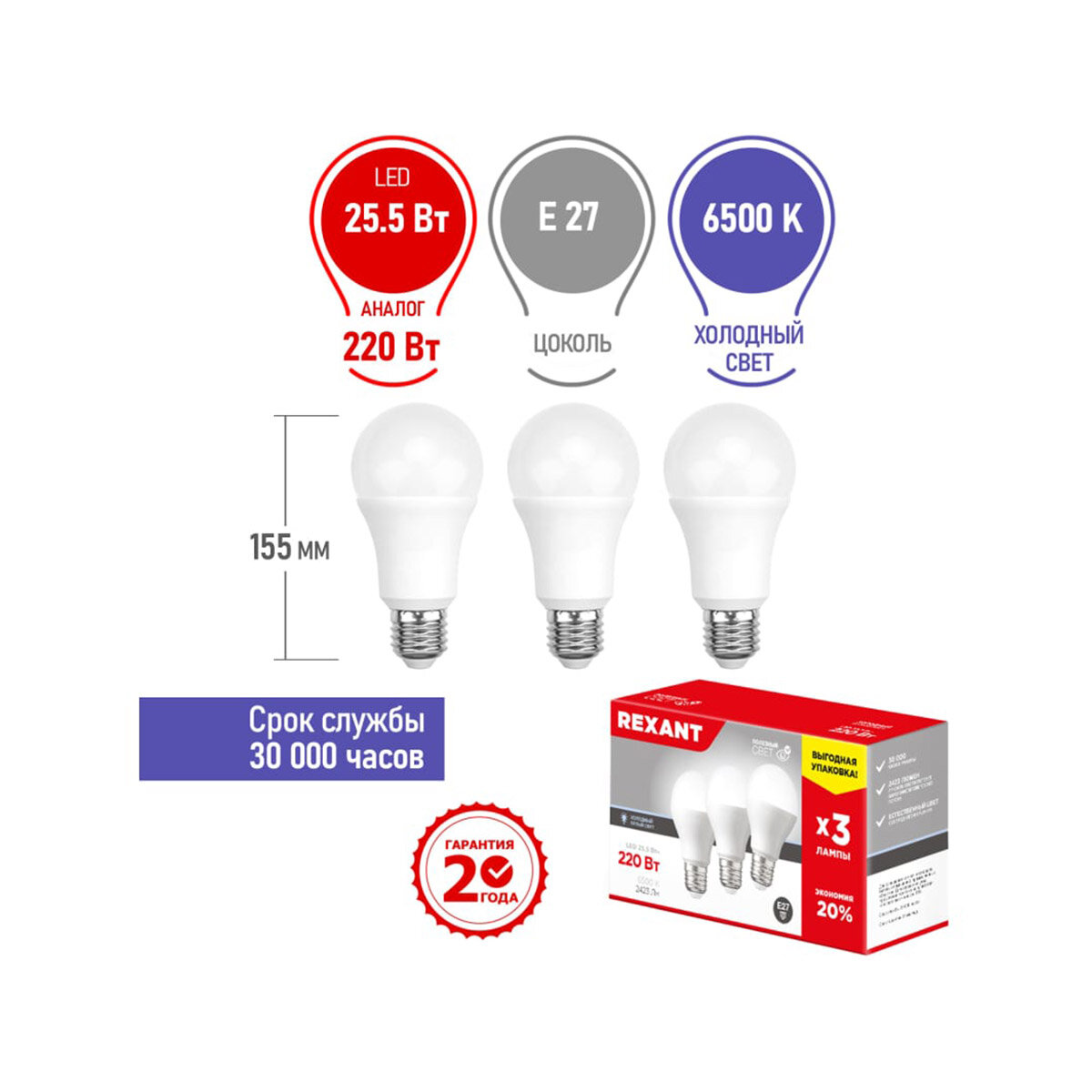 Упаковка светодиодных ламп 3 шт. REXANT 604-202-3, E27, A60, 25.5 Вт, 6500 К