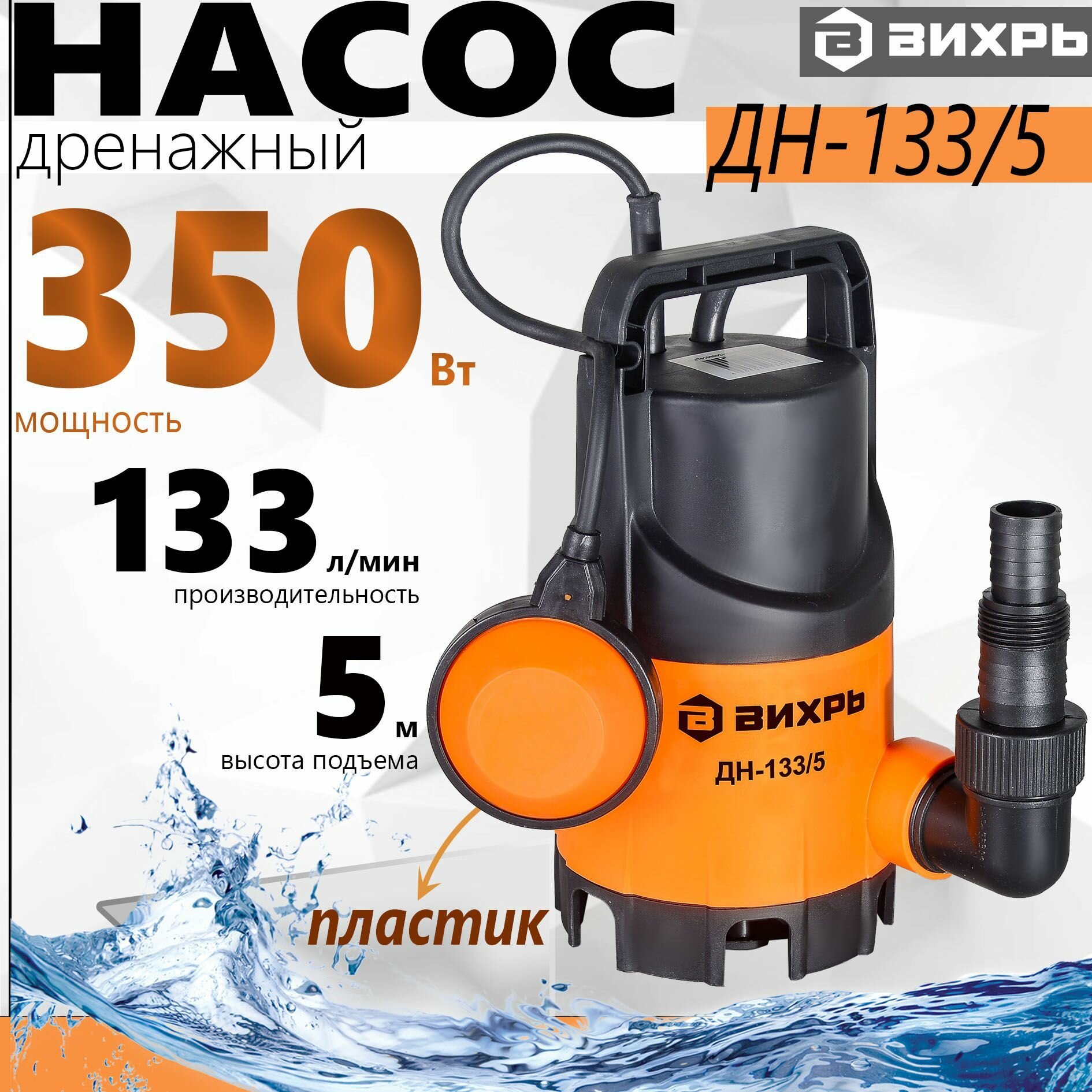Дренажный насос Вихрь ДН-133/5, 350 Вт, макс. напор – 5 м, 133 л/мин, для грязной воды, диаметр частиц – 35 мм