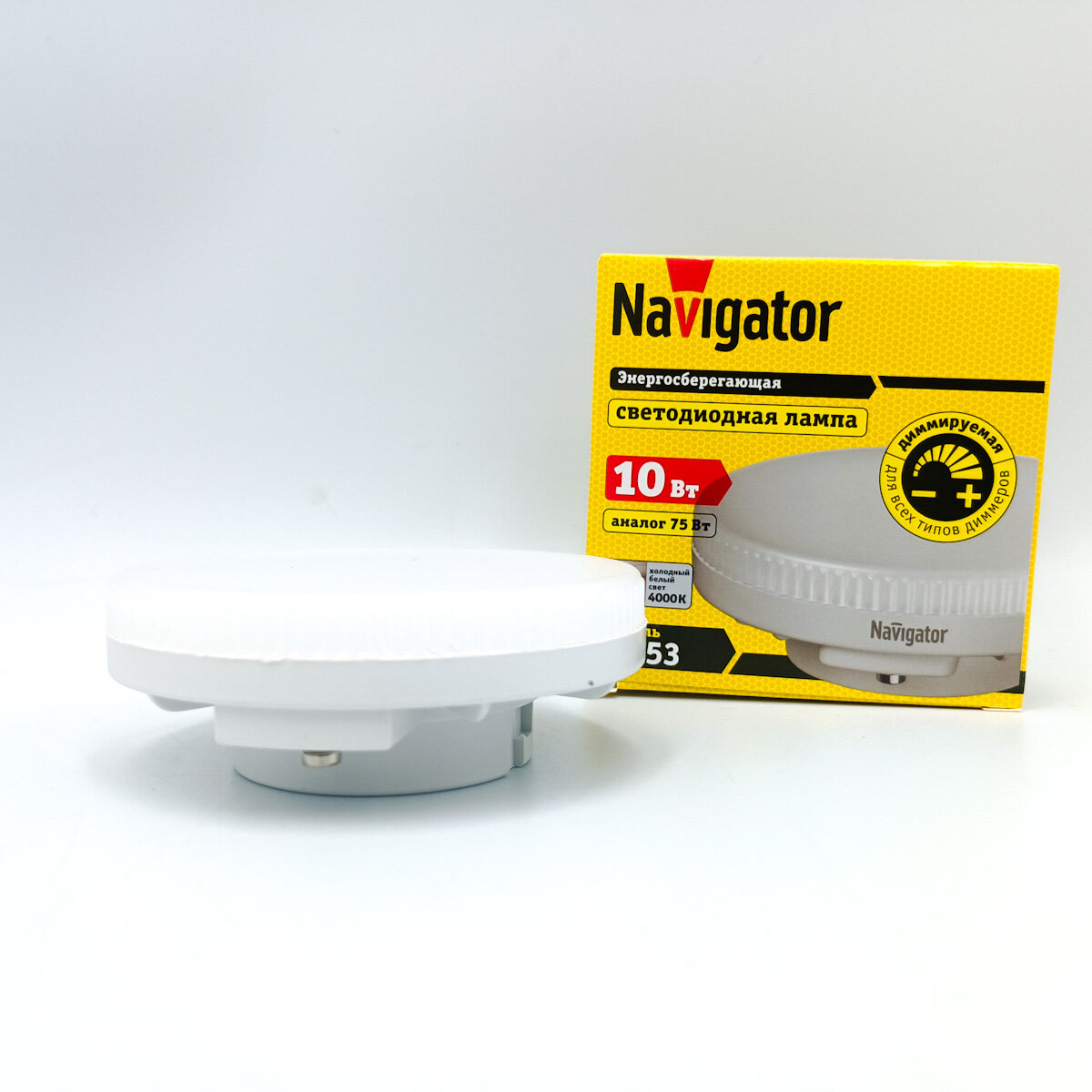 (10 шт.) Диммируемая светодиодная лампочка Navigator, таблетка, мощность 10 Вт, напряжение питания 220 В, цветовая температура 4000 К, нейтральный белый свет, цоколь GX53, размер 74х28 мм