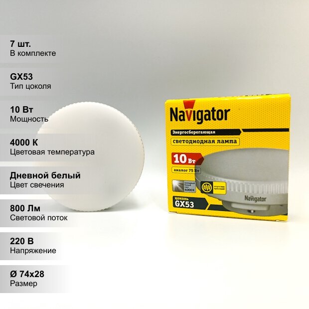 Купить (7 шт.) Светодиодная лампочка Navigator, мощность 10 Вт, напряжение питания 220 В, цветовая температура 4000 К, нейтральный белый свет, цоколь GX53, таблетка, размер 74х28