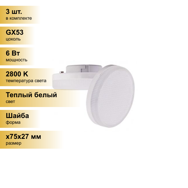 Купить (3 шт.) Светодиодная лампочка Ecola GX53 св/д 6W 2800K 2K 27x75 матов. Premium T5UW60ELC Теплый белый. Цоколь GX53