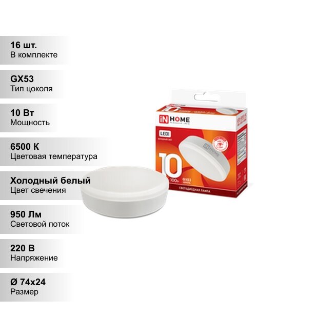 Купить (16 шт.) Светодиодная лампочка IN HOME 10Вт 230В 6500К GX53