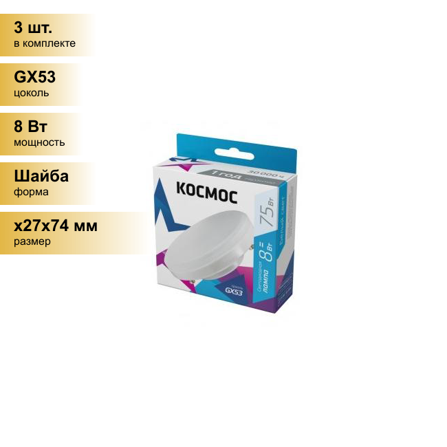 (3 шт.) Светодиодная лампочка Космос GX53 св/д 8W(740lm) 4500K 4K 24x75 матов. Lksm_LED8wGX5345C Нейтральный белый. Цоколь GX53