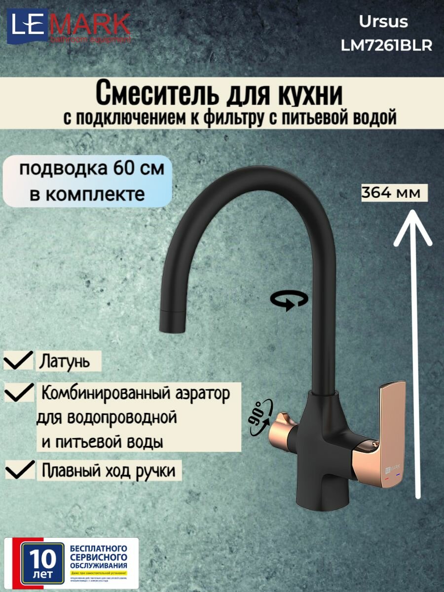 7261BLR Урсус Смеситель для кухни, с подключением к фильтру питьевой воды, черный/розовое золото LEMARK