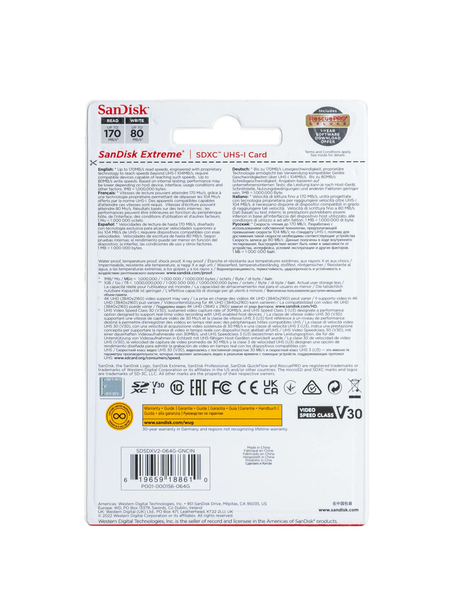 SD 64GB SanDisk SDXC Class 10 V30 UHS-I U3 Extreme 170MB/s SDSDXV2-064G-GNCIN