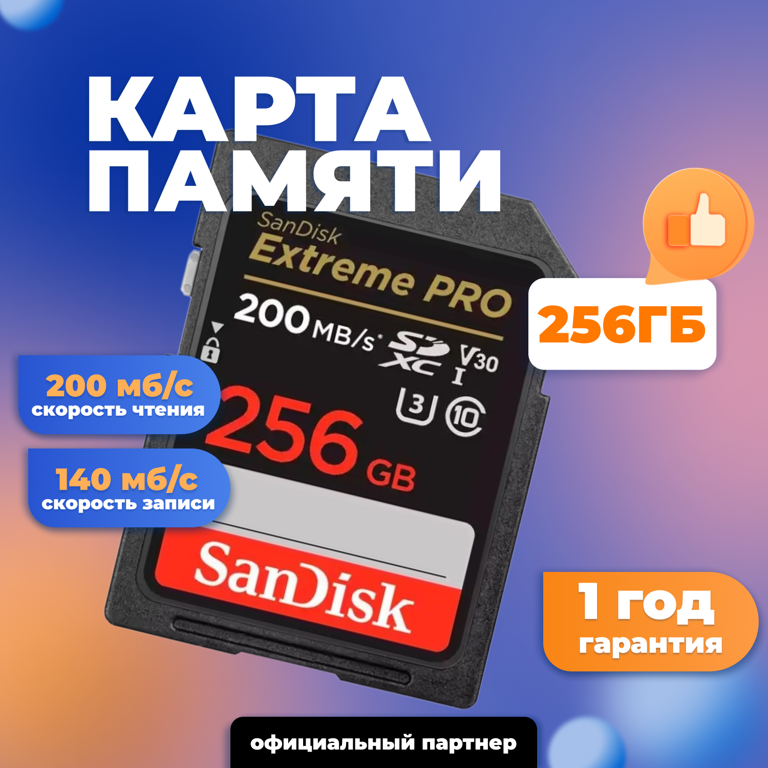 Карта памяти SanDisk SDXC Extreme Pro Class 10 UHS-I V30 U3 (200/90MB/s) 256GB