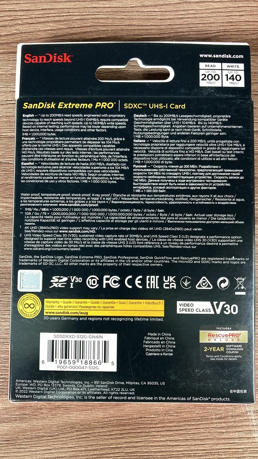 Карта памяти SanDisk Extreme PRO SDXC 512 ГБ Class 10 UHS-I U3 V30 (R/W 200/140 Mb/s)