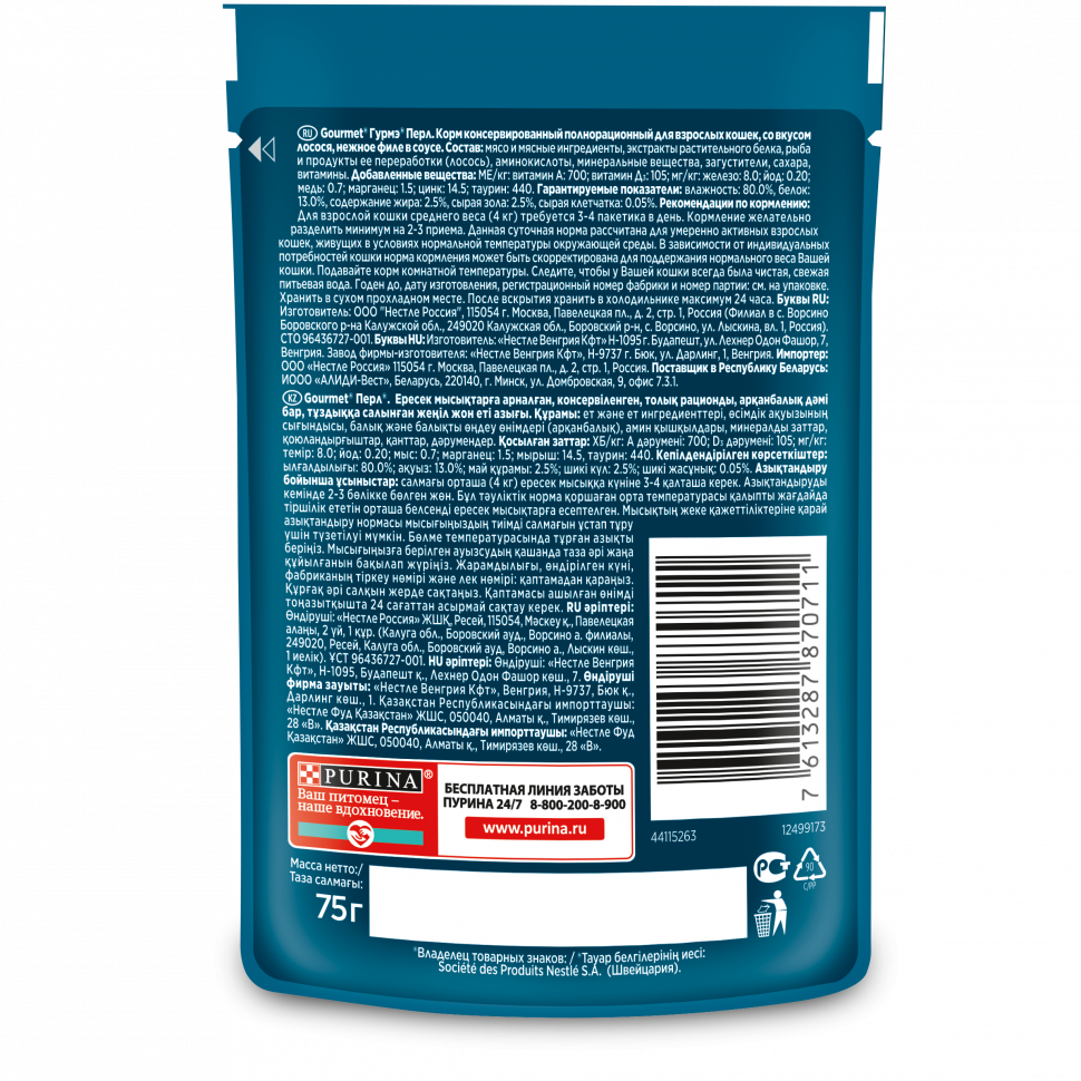 Влажный корм Гурмэ® Перл Нежное филе для кошек, с лососем в соусе, Пауч, 75 г*26 шт