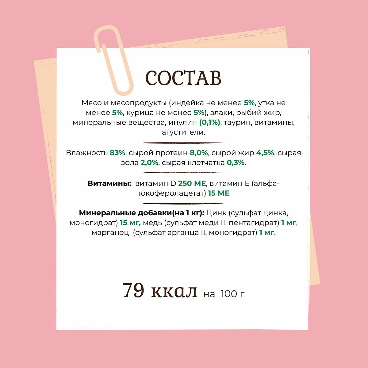 | Состав | мясо и мясопродукты (5% каждого вида птицы), злаки, минеральные вещества, инулин (0,1%) |