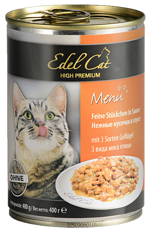 Влажный корм для кошек Edel Cat консервы нежные кусочки в соусе 3 вида мяса птицы 0,4кг (12 шт)