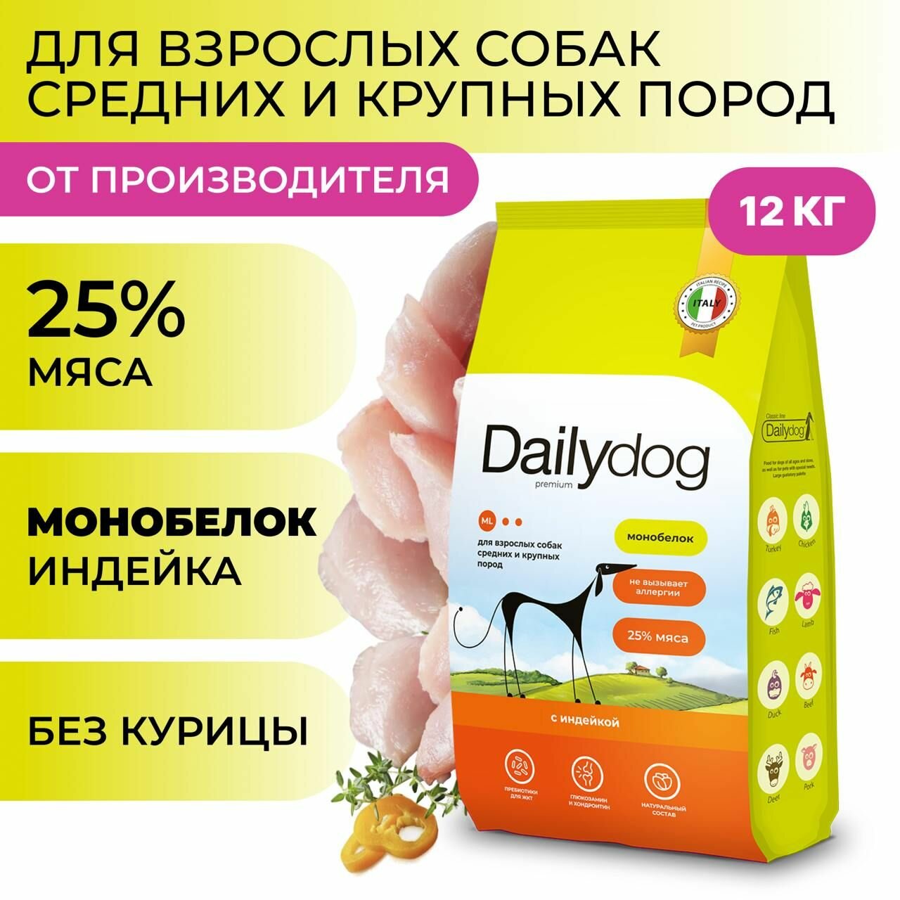 Сухой корм Dailydog для собак средних и крупных пород, с индейкой, 20 кг