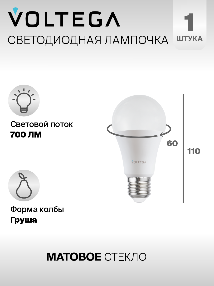 Лампочка светодиодная E27 форма груши 11W нейтральный свет Voltega Simple А60 4000K упаковка 6 штук