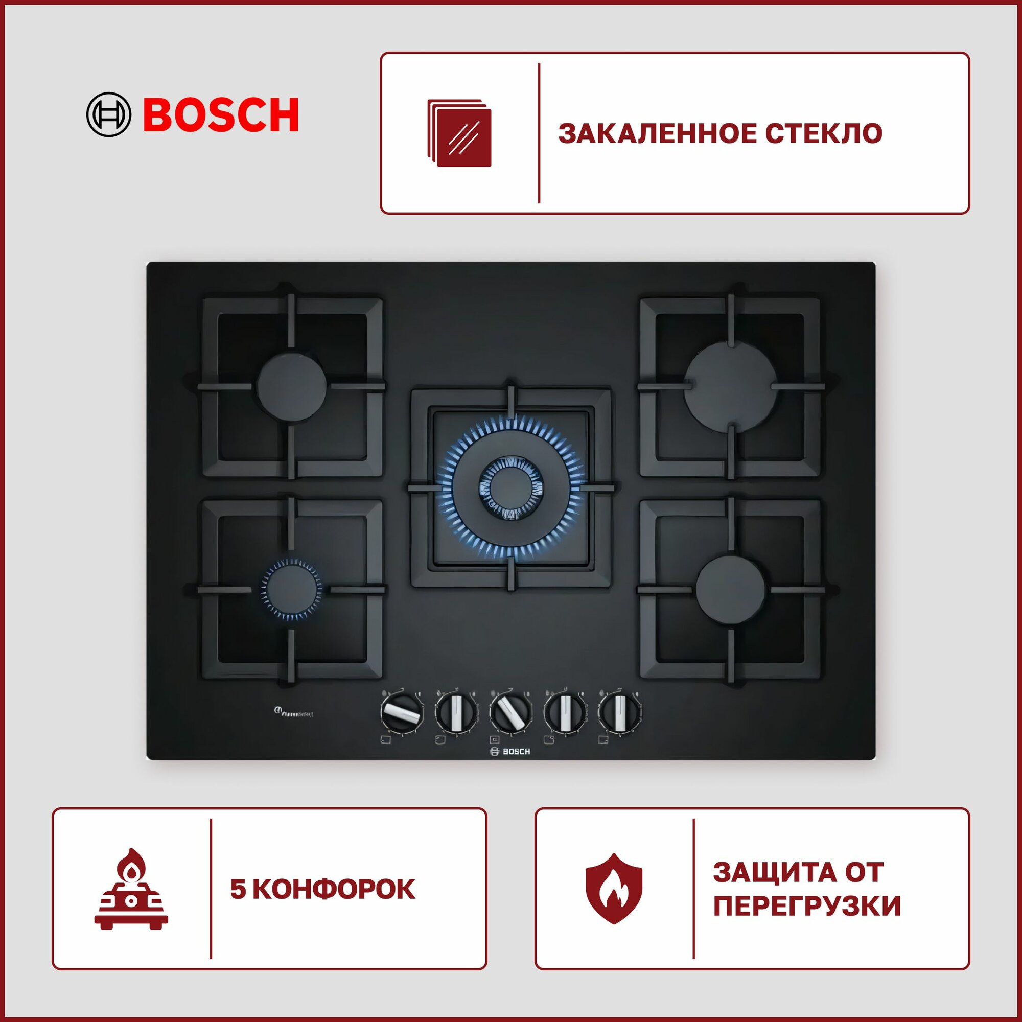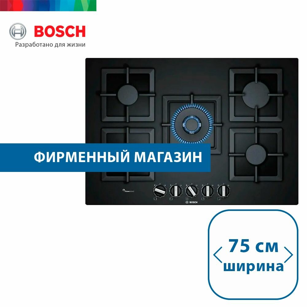 BOSCH Встраиваемая газовая панель BOSCH варочная панель, 75см, закаленное стекло, черная, 5 конфорок, 1 WOK-конфорка c 2 контурами пламени, 1 конфорка повышенной мощности, FlameSelect, индивидуальные чугунные решетки, газ-контроль, автоматический электроп