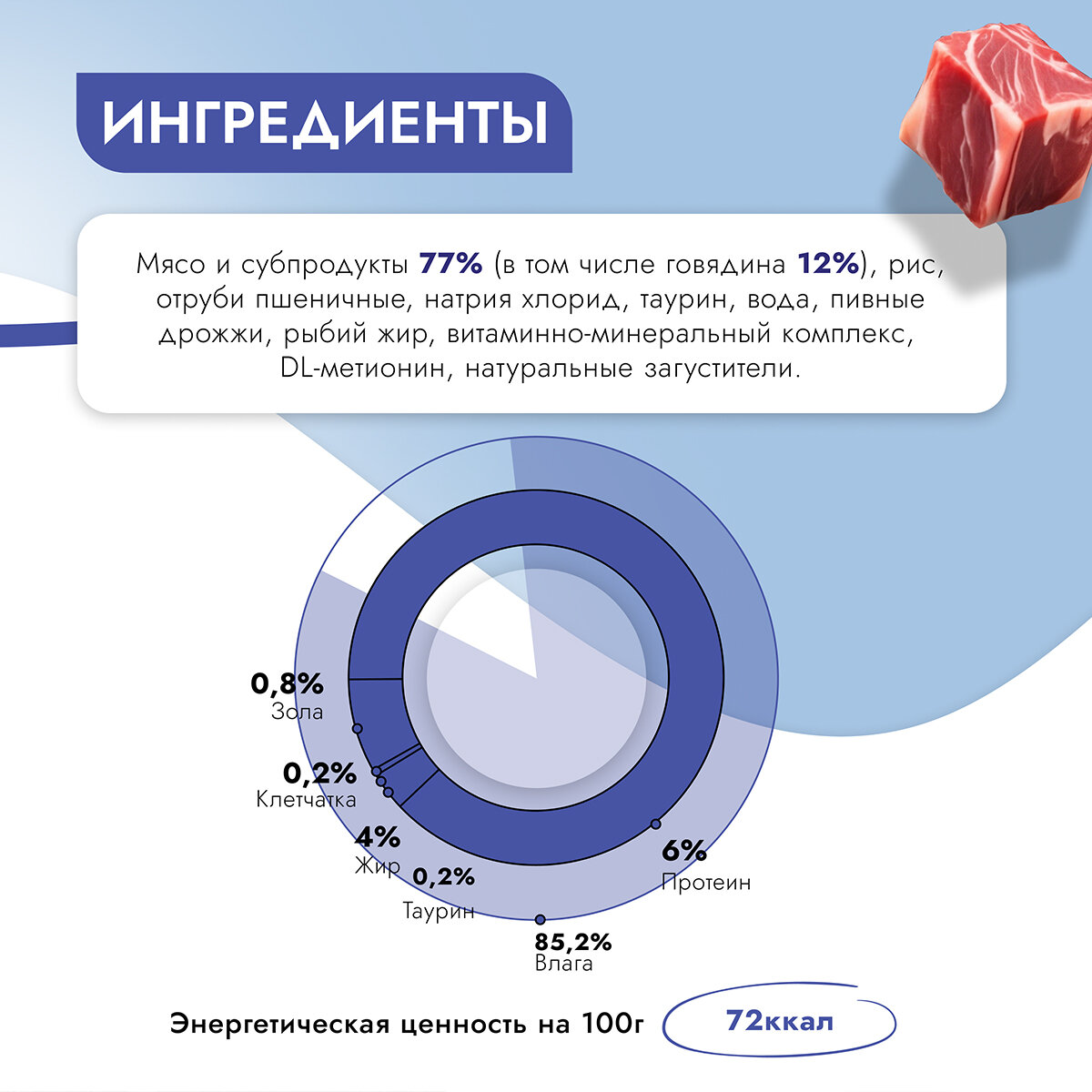 | Состав | говядина, таурин, желирующая добавка, соль, вода питьевая |