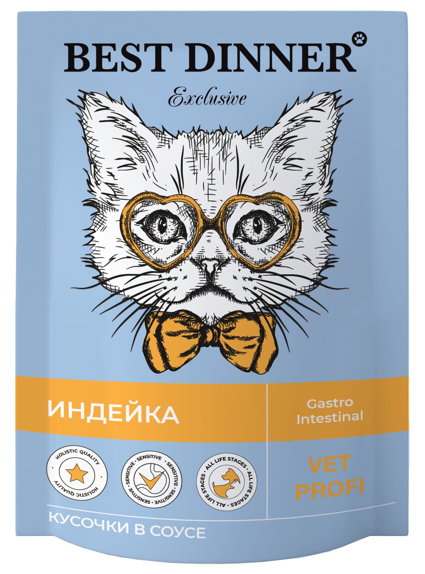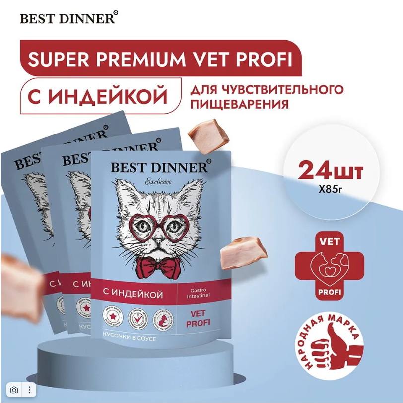 Влажный диетический корм Best Dinner VET PROFI Gastrointestinal для кошек при заболеваниях ЖКТ кусочки в соусе Индейка, 85 г х 24 шт, пауч (Бест Диннер)