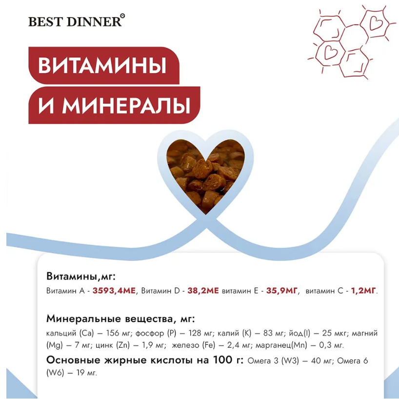 | Витамины | в 100 г: таурин 0,3 г |