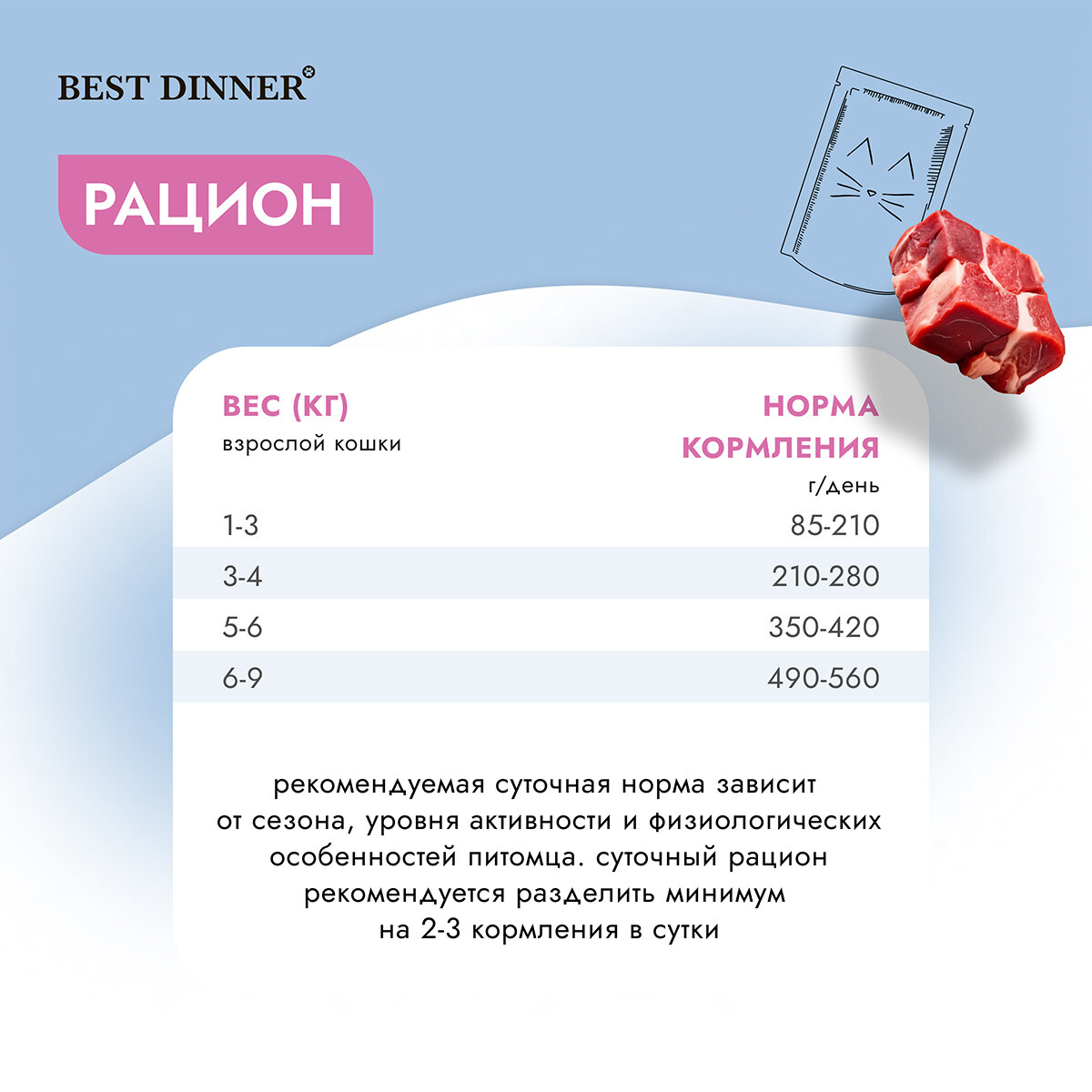 | Дозировка | Норма потребления корма для кошек 30-50 г на кг веса животного в 2 приема кормления. Норма потребления корма для котят 40-60 г на кг веса животного в 2-3 приема кормления |