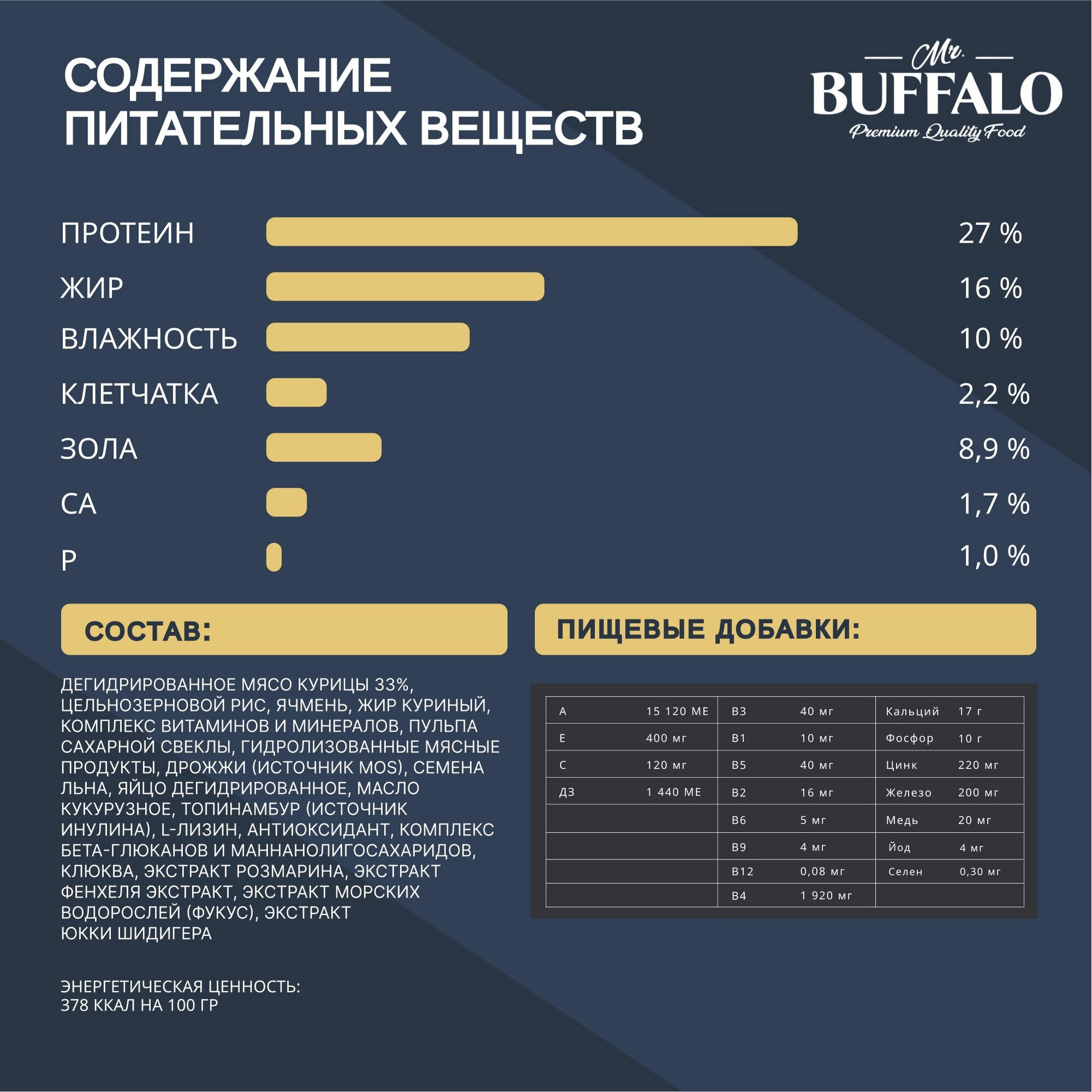 | Состав | дегидрированное мясо курицы (35%), цельнозерновой рис, маис, жир куриный, пульпа сахарной свеклы, витаминно-минеральный премикс (витамины: А, D3, E, B1, В2, В3, B4, B5, B6, B9, B12; минералы: железо, цинк, марганец, медь, калий, йод, селен), гидролизованные мясные продукты, семена льна, дегидрированное яйцо, масло кукурузное, дрожжи (источник MOS), топинамбур (источник инулина), L-лизин, антиоксидант, пребиотик MacroGard® (источник β-глюканов), клюква, экстракт розмарина (природный антиоксидант и натуральный консервант), экстракт фенхеля (источник витаминов, микро- и макроэлементов), экстракт морских водорослей (фукус), экстракт Юкки Шидигера |
