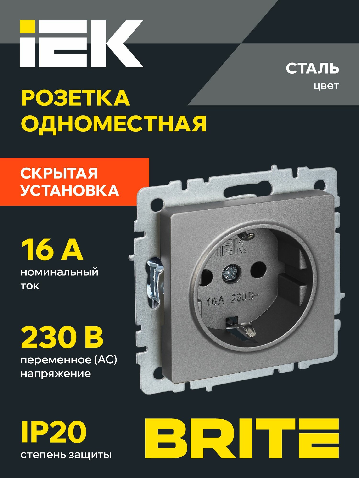 BRITE Розетка с заземлением с защитными шторками 16А РС14-1-0-БрС сталь , IEK BR-R14-16-K46 (1 шт.)