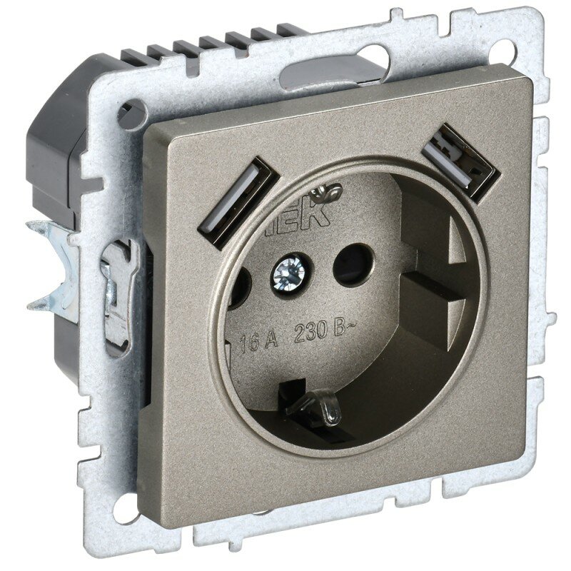 Розетка BRITE РЮш10-2-БрШ 16А с USB A+A 3.1А с заземл. защ. шторки шампань IEK BR-R14-16-U21-D31-K37