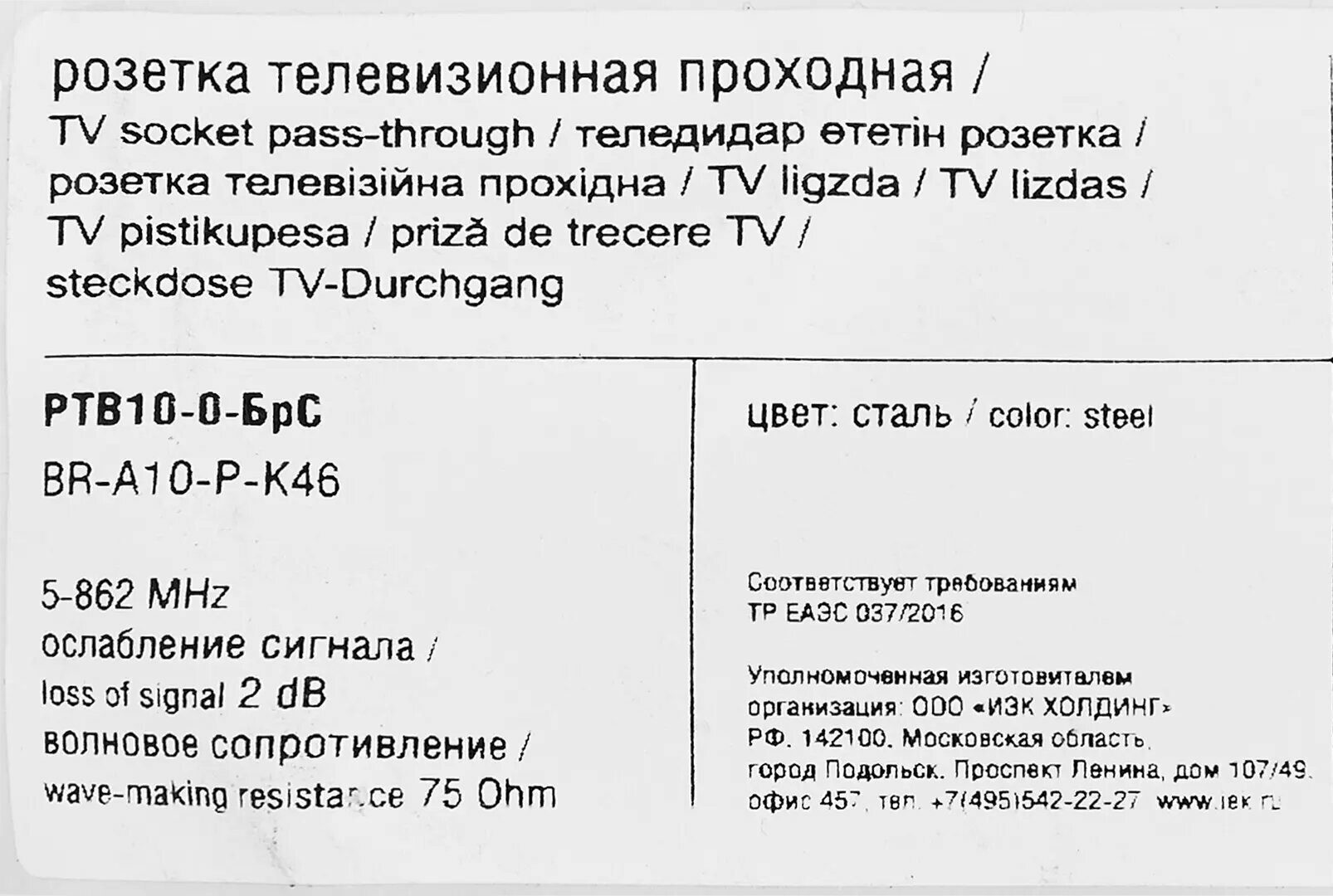 Купить BRITE Розетка TV проходная РТВ10-0-БрС сталь IEK
