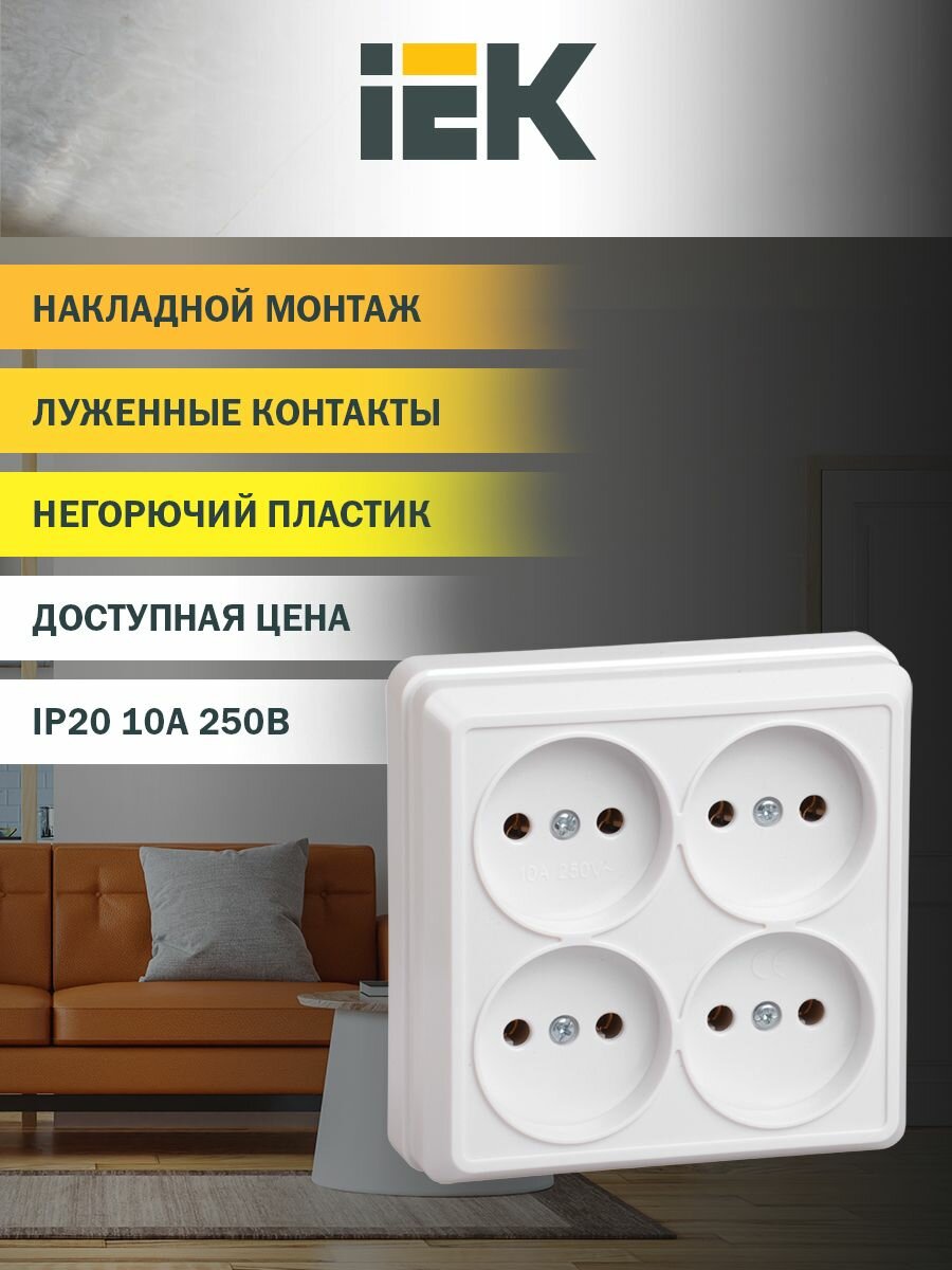 Розетка четверная накладная IEK Октава, с заземлением, 16 А, 250 В, IP20, белая