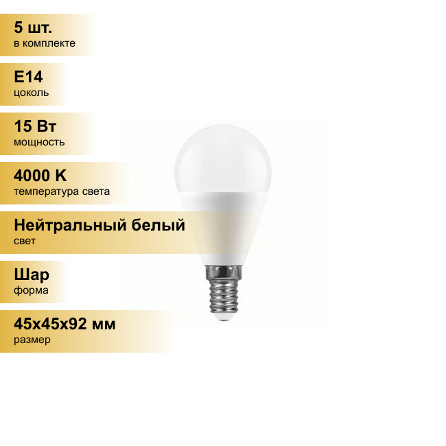 Купить (5 шт.) Светодиодная лампочка Saffit шар G45 E14 15W(1275Lm) 4000K 4K матовая 92x45 SBG4515 55210 Нейтральный белый. Цоколь E14