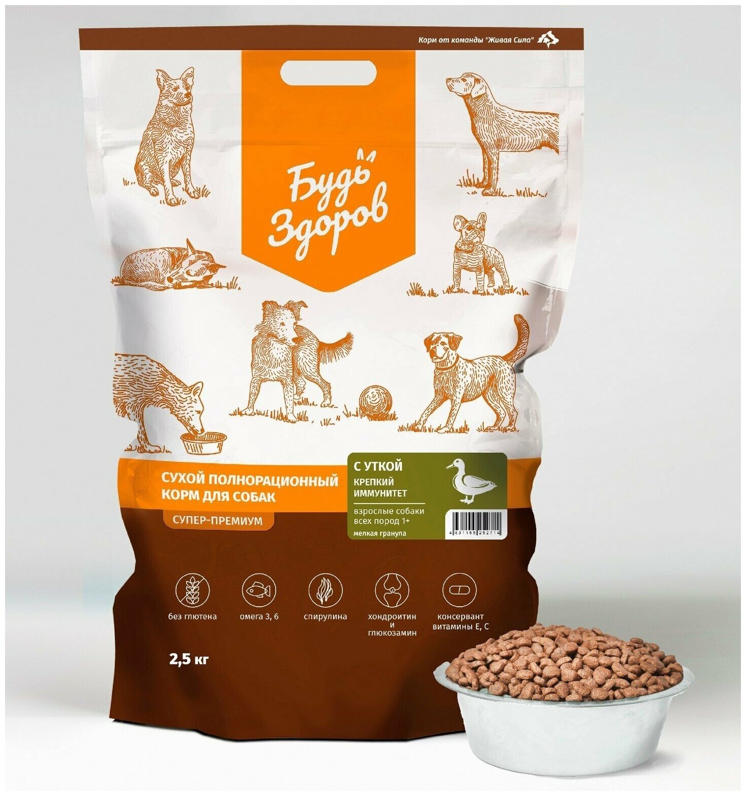 Живая Сила Будь Здоров сухой корм с уткой для взрослых собак всех пород. Крепкий иммунитет. Мелкая гранула 2,5 кг