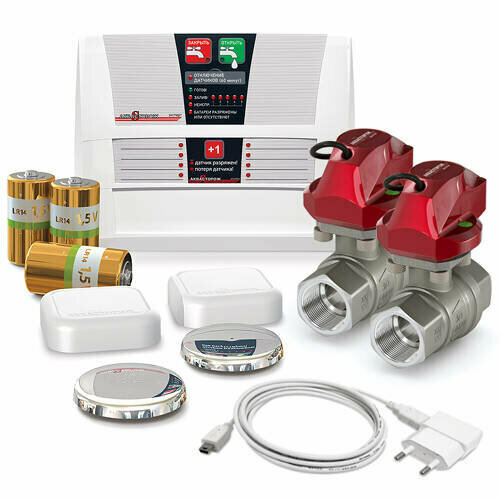 | Подробная комплектация | 2 крана RuB (BONOMI, Италия) 3/4" (ДУ 20мм) с приводом "Аквасторож Оригинал" мод.0808.1, контроллер Эксперт+, Радиобаза + 2 беспроводных датчика, 1 проводной датчик Эксперт (провод 2м), батареи LR14 (тип "C") 3шт, крепеж, блок питания 5В "Robiton" |