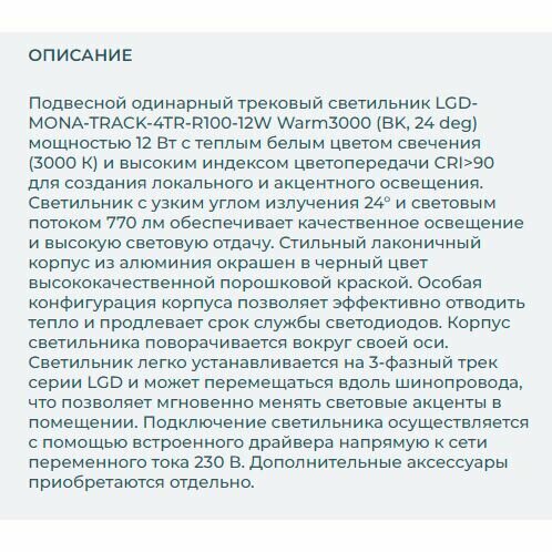 Светильник LGD-MONA-TRACK-4TR-R100-12W Warm3000 (BK, 24 deg) (arlight, IP40 Металл, 3 года)