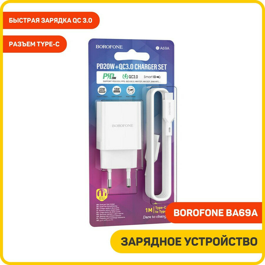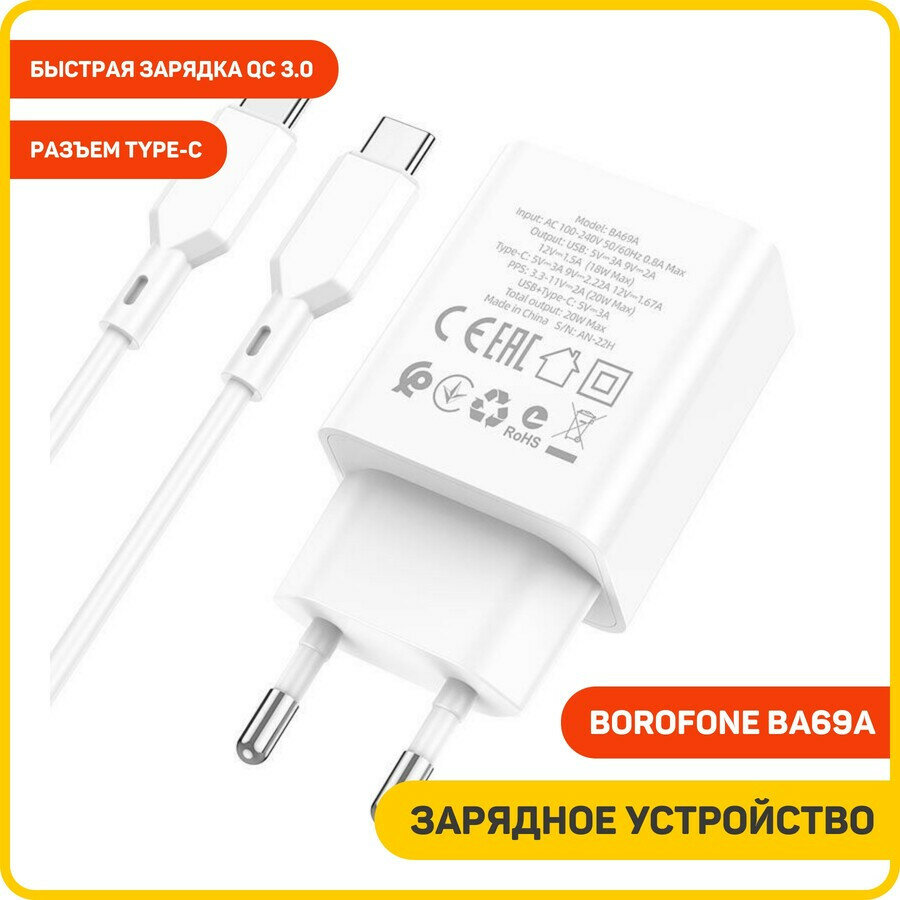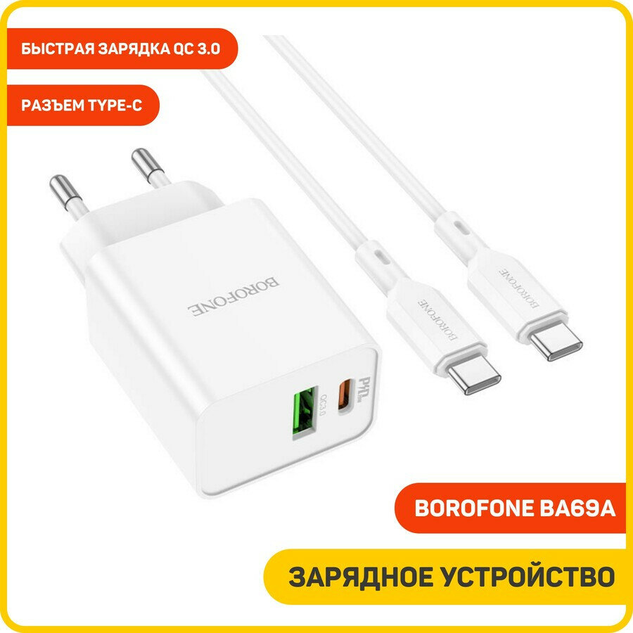 Сетевое зарядное устройство (СЗУ) Borofone BA69A (USB/Type-C PD) + кабель Type-C-Type-C, 1 м, белый