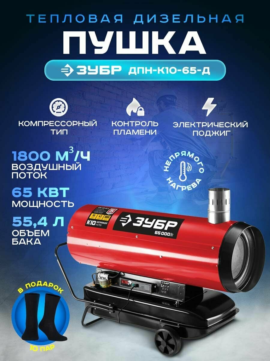 Ниже Вы можете прочитать отзывы на Тепловая пушка дизельная Зубр ДПН-К10-65-Д, 65 кВт, ознакомится с подробными характеристиками, посмотреть интересные обзоры и фотографии на Тепловая пушка дизельная Зубр ДПН-К10-65-Д, 65 кВт.