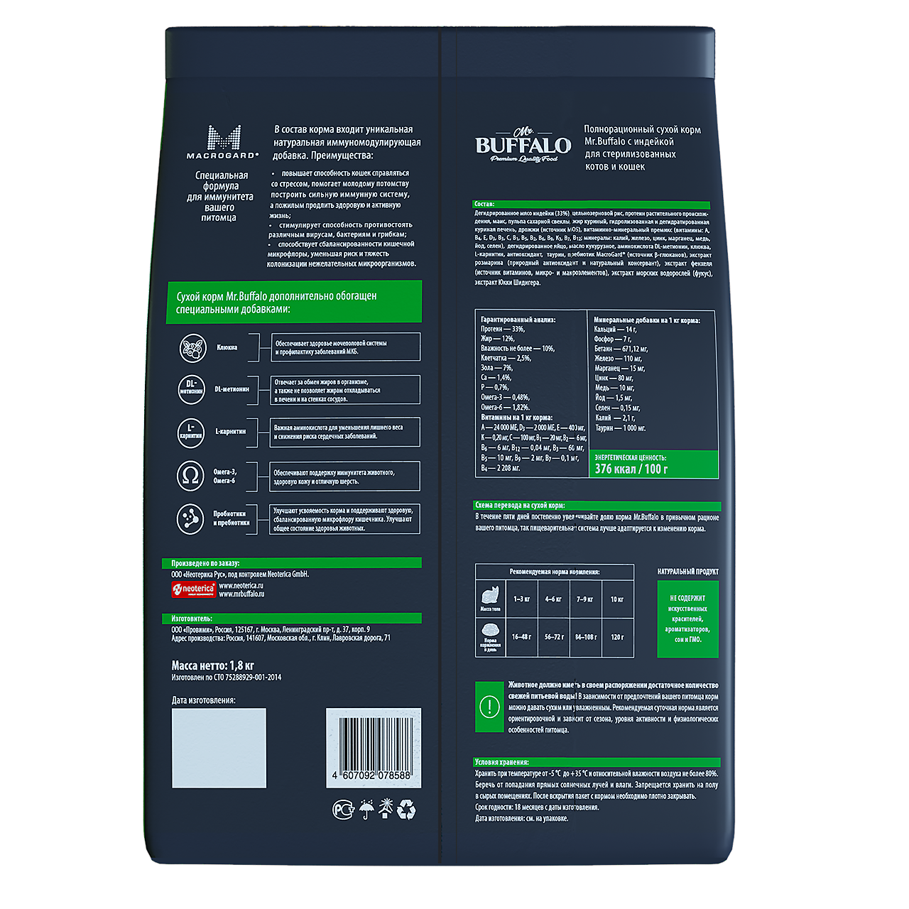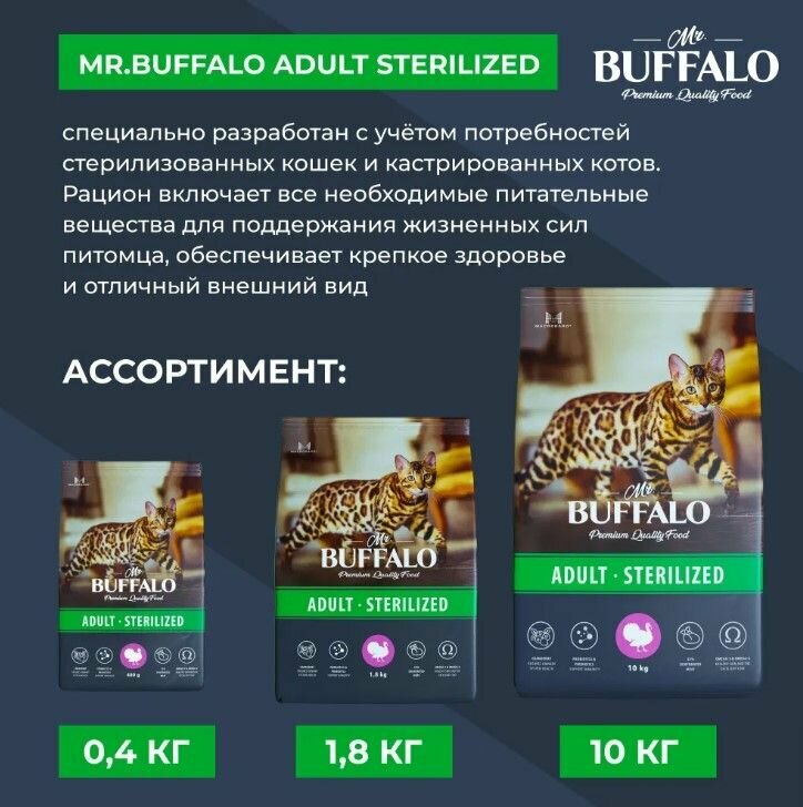 Сухой Корм Mr.Buffalo (Мистер Буффало) Для Стерилизованных Кошек Индейка Adult Sterilized 1,8кг, 1 шт