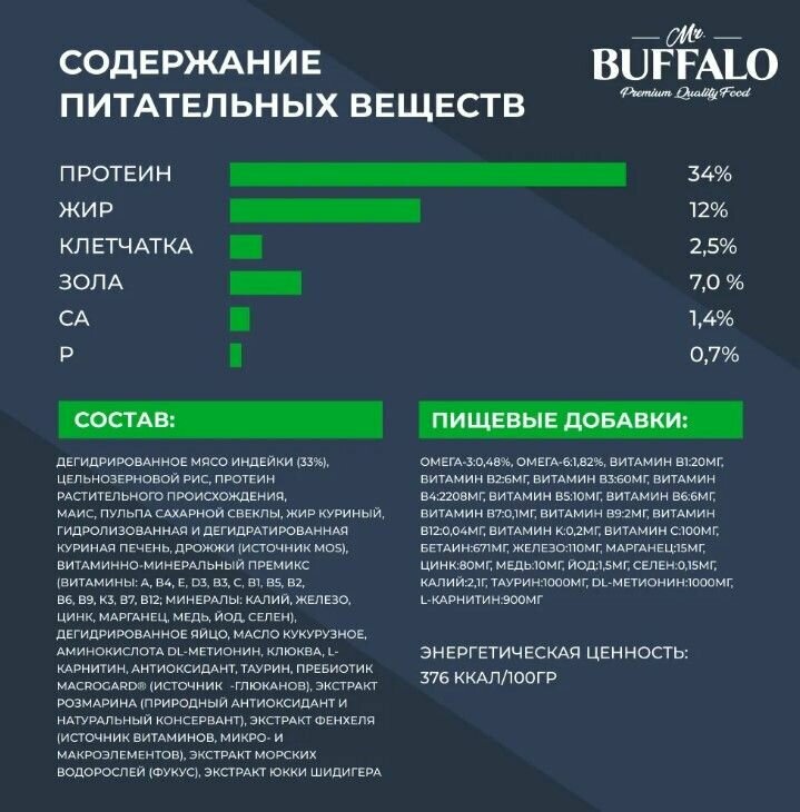 | Состав | дегидрированное мясо индейки (33%), цельнозерновой рис, протеин растительного происхождения, ячмень, жир куриный, пульпа сахарной свеклы, гидролизованная и дегидратированная куриная печень, витаминно-минеральный премикс, дрожжи (источник MOS), семена льна, дегидрированное яйцо, аминокислота DL-метионин, антиоксиданты, таурин, глюкозамина гидрохлорид, хондроитина сульфат, пребиотик MacroGard (источник β-глюканов), экстракт розмарина (природный антиоксидант и натуральный консервант), экстракт фенхеля (источник витаминов, микро- и макроэлементов), экстракт морских водорослей (фукус), экстракт юкки Шидигера |