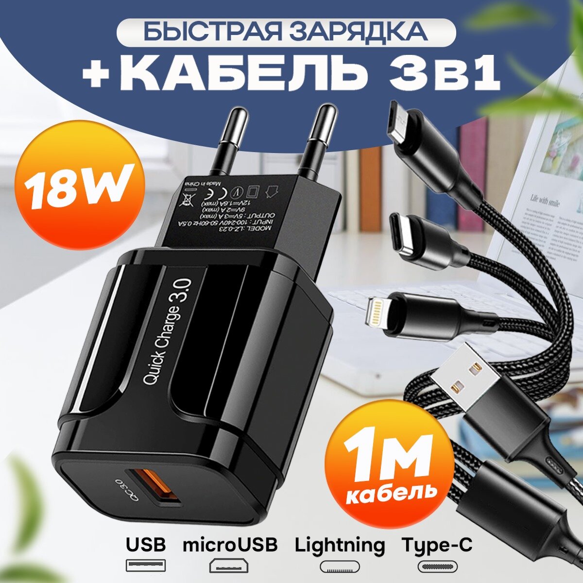 СохранитьКомплект Быстрая зарядка для телефона + кабель 3в1 (18W/QC3.0A) на Android и iPhone / Сетевой блок питания / Скоростной адаптер / цвет черный интересное: