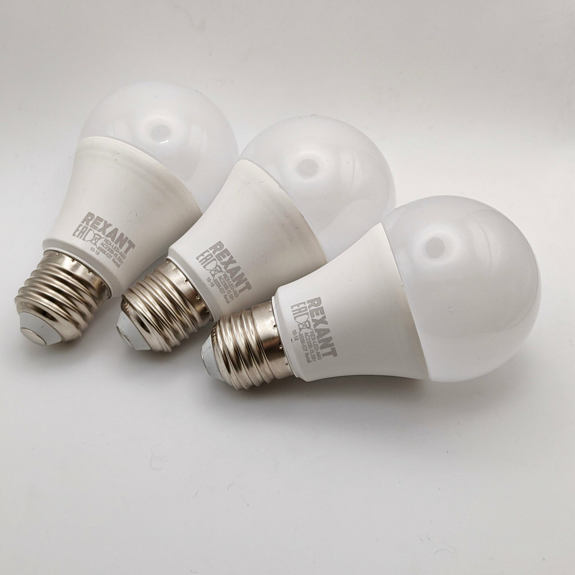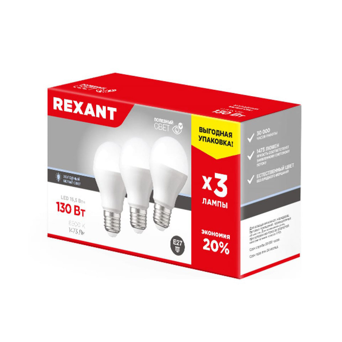 Светодиодная лампа Rexant Груша E27, 15.5 Вт, A60, 1473 Лм (=130 Вт), 6500 K (холодный свет), упаковка 3 шт.