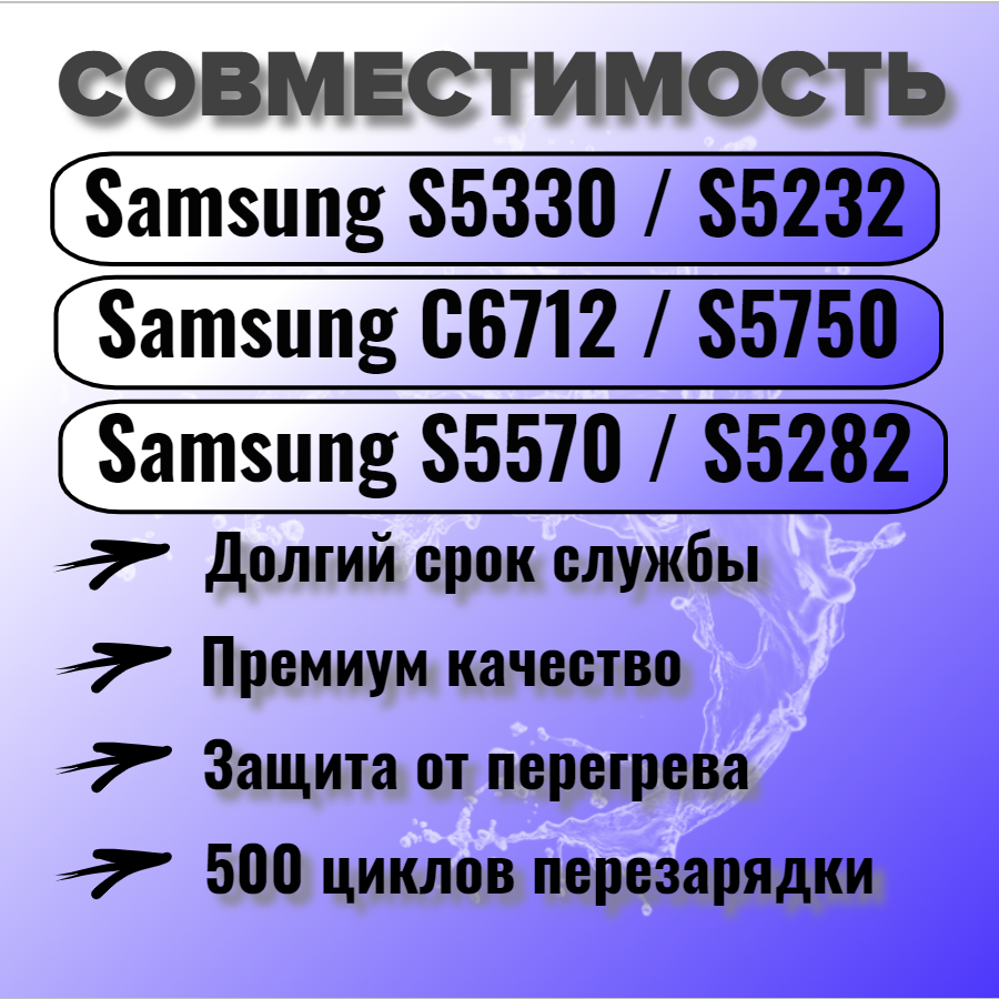 | Совместимость | Samsung Galaxy Mini GT-S5570 / GT-S5750E / T499 / Wave GT-S5330 / 578 / SCH-i559 / Hello Kitty GT-S5780 / GT-S7230 / GT-S7230E / Wave 2 GT-S5250 / 525 Pearl / Romantic / Galaxy S WiFi 4.0 GT-C6712 / Star II Duos GT-i5510 / Galaxy 551 / Dart |