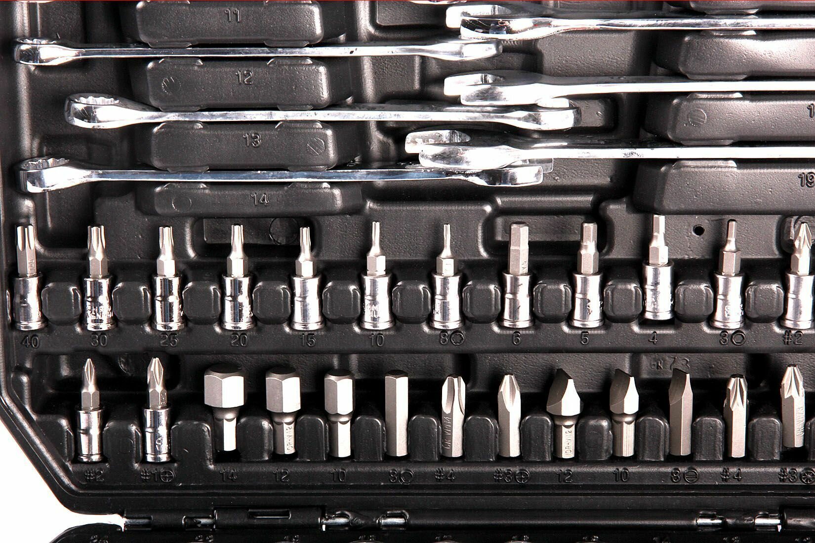 | Головки торцевые подробно | 1/2": 24, 22, 19, 18, 17, 16, 15, 14, 13, 12, 10, 8; 1/4": 13, 12, 11, 10, 9, 8, 7; свечная головка 1/2": 16, 21 |