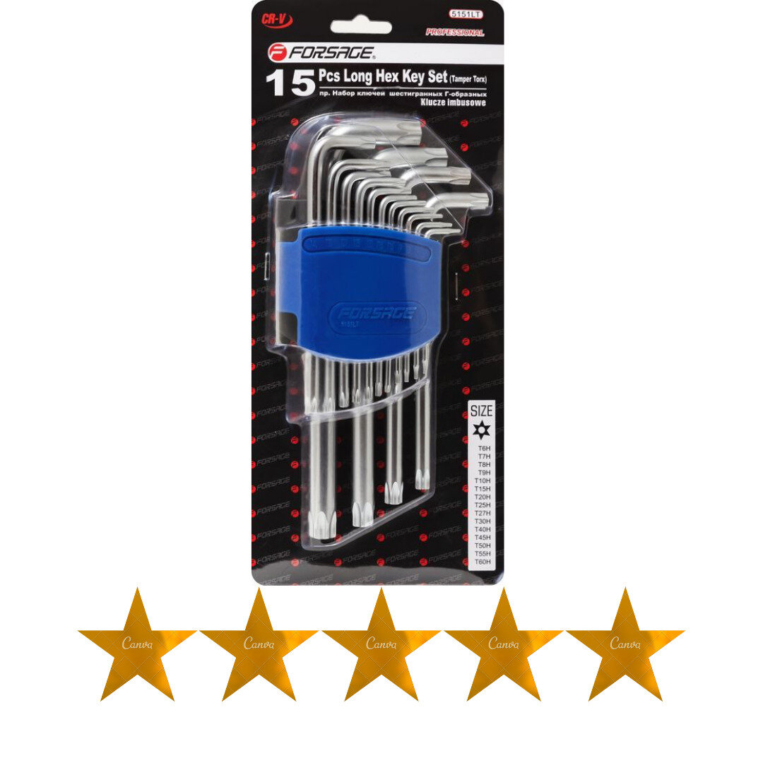 Набор ключей L-образных TORX длинных, 15пр.(Т6Н, T7H, T8H, T9H, Т10Н, Т15Н, Т20Н, Т25Н, Т27Н, Т30Н, Т40Н, Т45Н, Т50Н, Т55Н, Т60Н с отверстием) FORSAGE F-5151LT