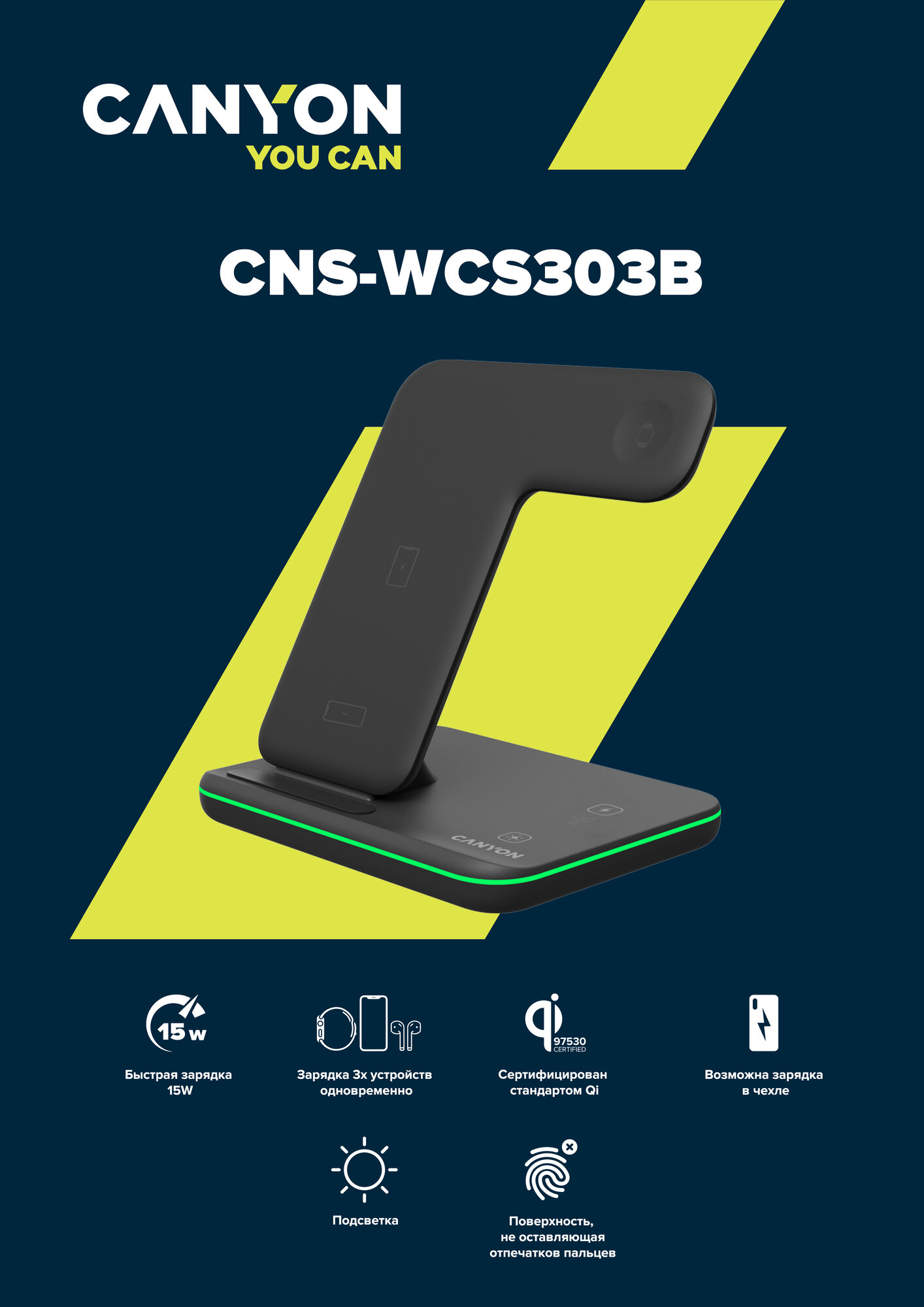 Беспроводное зарядное устройство Canyon 3в1 с технологией Qi CNS-WCS303B