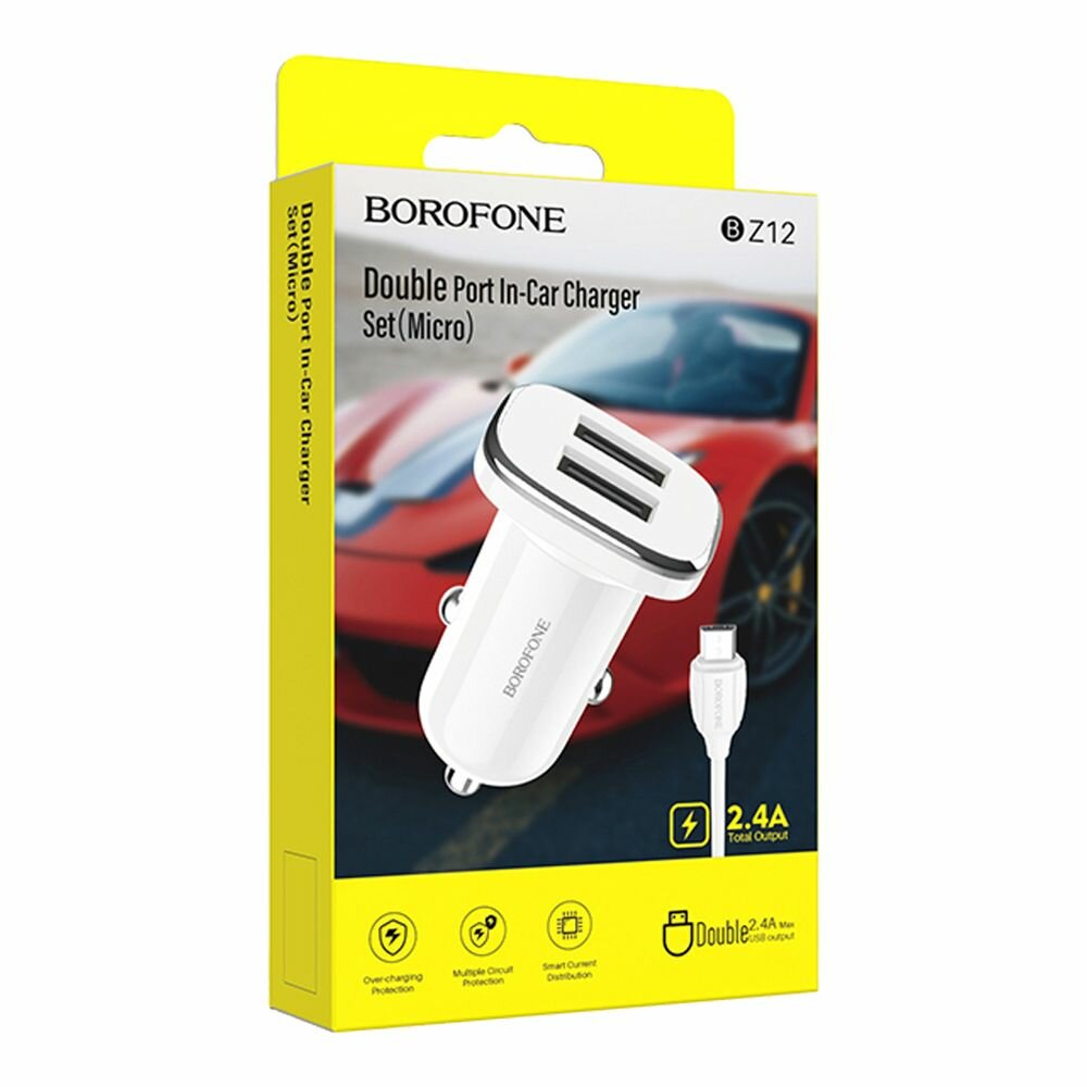 Автомобильное зарядное устройство Borofone BZ12 Lasting Power 2xUSB, 2.4A + кабель MicroUSB, 1м, белый