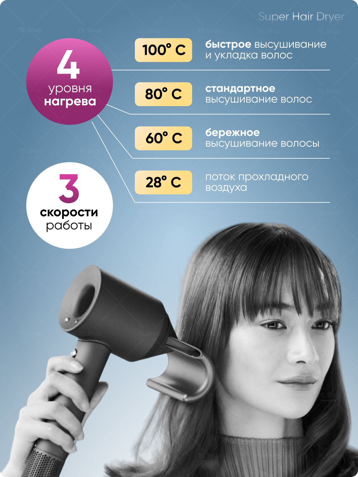 Профессиональный фен для волос Hair-1600 Super Hair Dryer 1600 Вт, 3 режима, 5 магнитных насадок, ионизация воздуха, розовый